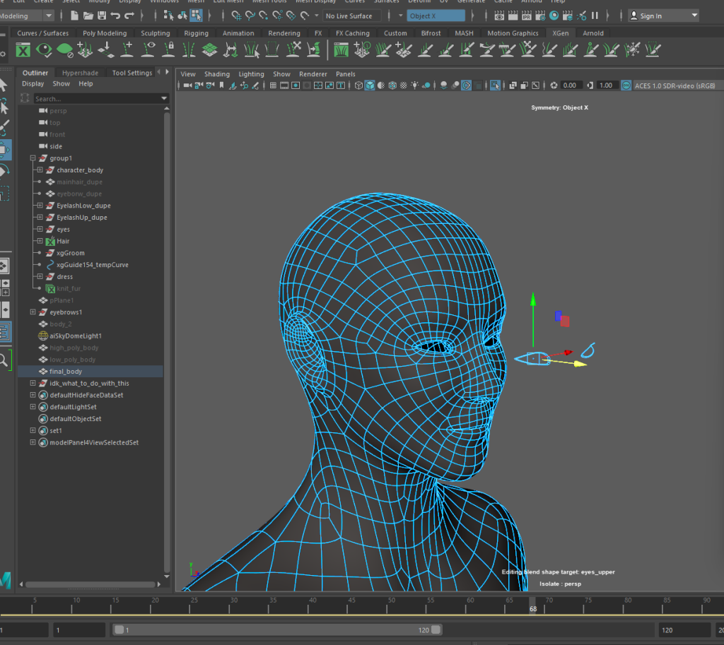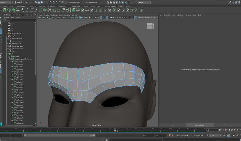 I also re-did the eyebrows and eyelashes in XGen, using the same base as my previous model meant that the process what a lot faster. I used vertices to move the base to fit the shape of this model, then refreshed the Xgen splines that I had already created. I moved them lower on the face. Its too heavy at the moment, so I’ll work in the density next.