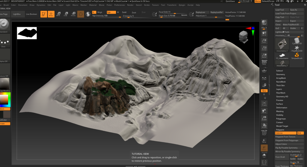 Once happy with the size and overall shape I imported the model to Zbrush to sculpt in the detail. Primarily using the Standard and DamStandard brushes I sculpted mountains according to various reference photos for inspiration.