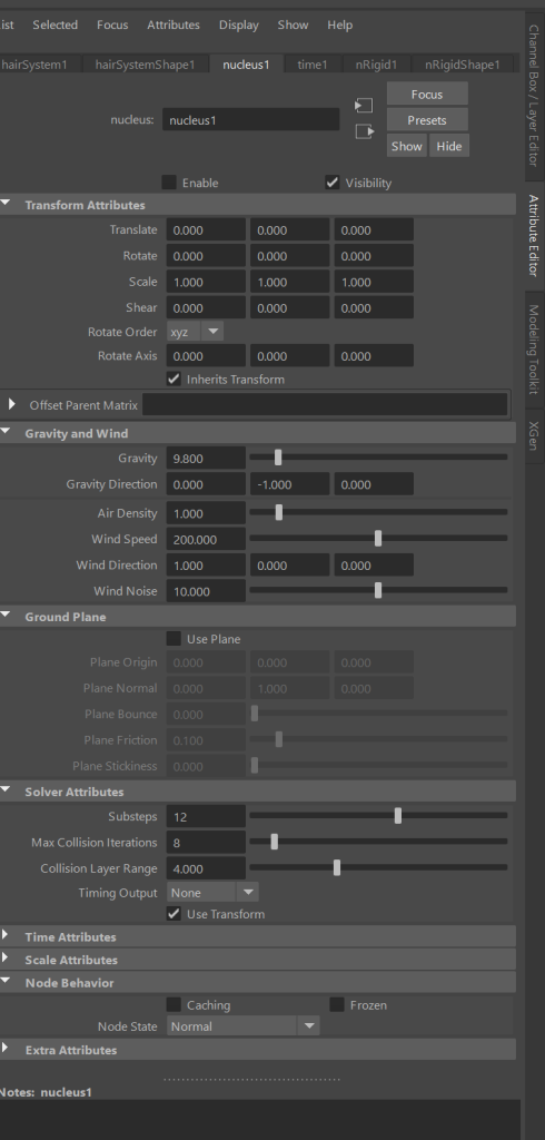Next I changed the settings on the ‘Nucleus’ node, changing the solver attributes and adding wind speed and noise.