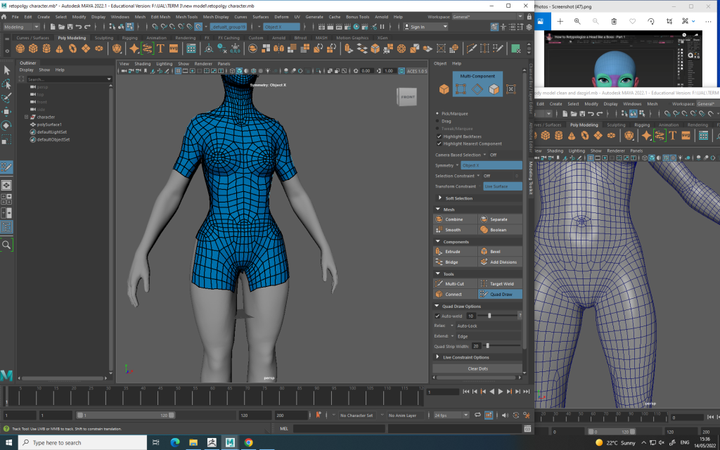 Next I needed to re-topologise the character, using the quad-draw tool in Maya I followed a tutorial that explained the most efficient geometry needed to create an animated human model.