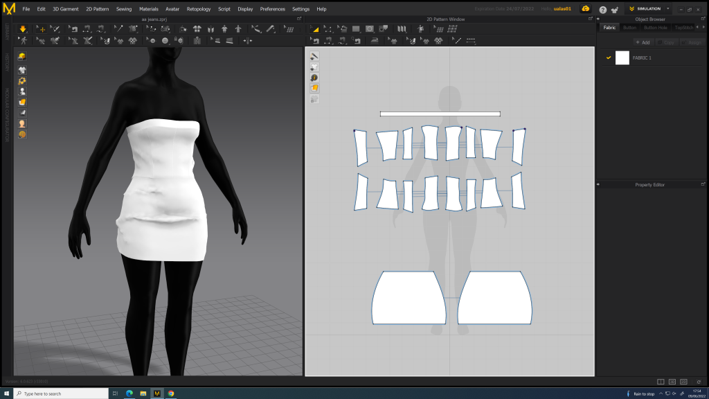 I started experimenting on Marvelous Designer, I used the ‘pants’ pre-pack. This gave me the basic shape of the trouser pattern. I want to widen the leg and tighten the waist, then create a waistband.